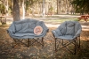 Supreme comfortability and ample space to kick back and relax. Fully padded seating including a convenient insulated drink holder. One size fits all, rated to 350 lbs. Durable ribbed 600D polyester fabric. Sturdy 3/4" black tube frame and stabilizer feet. Padded back & arm rests. Includes insulated beverage holder and carry bag. 34"H x 34"W x 27"D. Seat height: 16". Carry bag not covered under warranty.